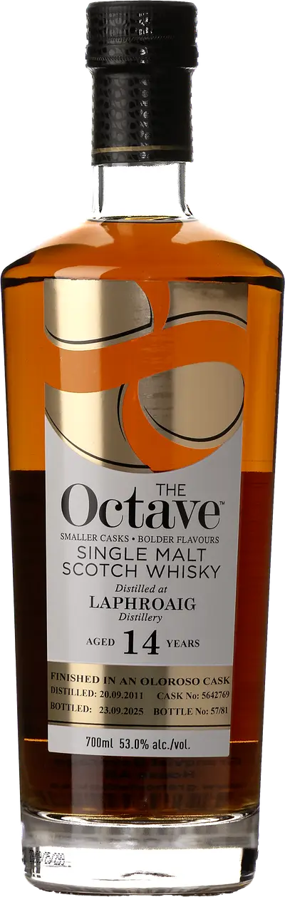 Laphroaig är ett destilleri på ön Islay, Skottland. Den välkända whiskyn tillverkas av vatten från Kilbride Stream och torven hämtas från Machrie Moor. Till skillnad från många andra destiller väljer Laphroaig att låta det blöta kornet dra med torvrök innan det torkas. I 10-12 timmar får röken stiga genom ett perforerat torkgolv in till kölnan. Torven bränns vid en relativt låg temperatur, vilket ger de toner av tjära som finns i whiskyn. När kornet är mältat sprids det ut på nät och höjs 16 fot över torvelden. På detta avstånd tar torkningen längre tid och ju längre kornet förblir fuktigt, desto mer smak absorberar det. Laphroaig har sju kopparpannor för dubbeldestillering. Första destilleringen sker i en av de tre stora mäskpannorna och andra i en av de fyra mindre spritpannorna. Laphroaigs historia sträcker sig mer än 200 år tillbaka i tiden. Allt startade med bröderna Donald och Alexander Johnston, som började producera whisky av det överskott av korn som deras boskap fick som foder vintertid (för en skotte är whiskytillverkning det enda tänkbara alternativet när man får korn över). I slutet av 1815 hade whiskyproduktionen blivit mer lönsam än jordbruket och destilleriet Laphroaig föddes. Den här whiskyn har tappats av independent bottler Duncan Taylor, som en del av deras omtalade ”Octave Range”, där whiskyn lagras en andra gång på små ”Octave casks”. I dryga 40 år har Duncan Taylor experimenterat med att lagra whisky i små fat. Man har kommit fram till att det blir mer interaktion mellan fat och whisky på kortare tid i ett litet fat, än i ett stort under längre tid. När trä, luft och alkohol får samspela i ett litet utrymme resulterar det i en välbalanserad whisky med stor fräschör, balans och komplexitet. Duncan Taylor Taylor flyttar den inköpta whiskyn från originalfaten till sina egna, specialtillverkade oktavfat (från latinets octava = åttonde/åttondel). De begagnade faten plockas isär i tunnbinderiet och binds sedan till nya fat som rymmer ungefär en åttondel av originalfatets storlek. De små faten har en stor andel ”Angels Share” (uppåt 10%, beroende på fatets kvalitet och hur länge whiskyn lagras).